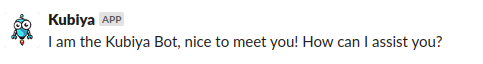 Send a ‘hello’ message to the Kubiya App. If your authentication was successful, you will recieve the following response from the app: