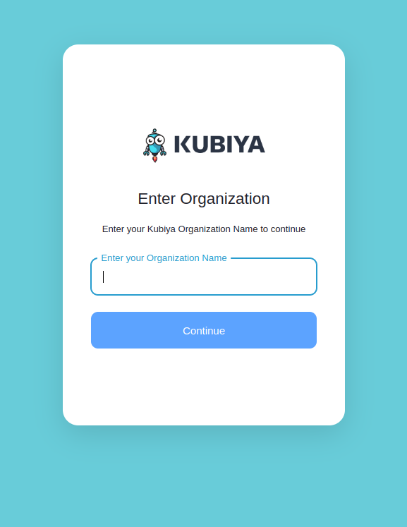 - Enter your organization name and click on the “Continue” button. The organization name is received from Kubiya upon registration.